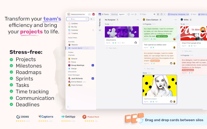 Ora is a collaborative, all-in-one project workspace and task management app for teams, with kanban, time tracking, chat, reporting, and third party integration.