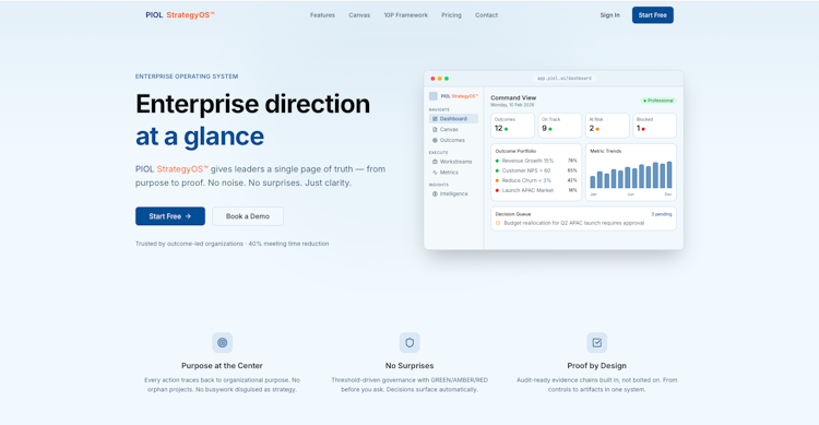 PIOL StrategyOS is an enterprise strategic management software platform that provides organizations with a unified system for aligning strategic direction with operational execution through evidence based governance. It supports leaders in executive and operational roles including chief executive officers, chief operating officers, vice presidents, directors, quality and compliance teams and workstream leads who require centralized management of organizational purpose, stakeholder value, strategic outcomes and traceable evidence chains.