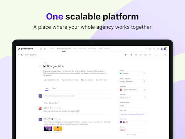 Productive is an end-to-end project management tool made for agencies and professional service business. Productive comes with an integrated Sales Pipeline, Resource Planning, and powerful Project Management features. With a strong focus on profitability, Productive also includes employee cost rates and company overhead costs into your profitability reports. As a cherry on the cake, we can also predict your future revenue with our resource planning and progress reports.