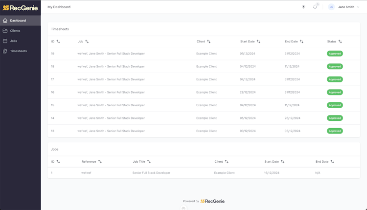 RecGenie is a comprehensive timesheet and expense management solution designed specifically for recruitment agencies. The software streamlines the back-office functions of recruitment firms, providing a suite of features that enhance efficiency and professionalism.