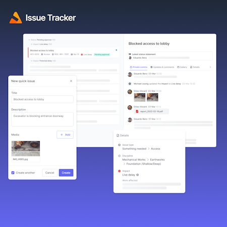 The software includes several interconnected modules specifically designed for construction field management. Core components include shift manager for daily reporting and resource allocation, issue tracker for managing blockers and problems, project gallery for file and image sharing, channels for secure project-wide communications, weekly work planner for planning and reporting, change tracker for monitoring and documenting changes, and data book for delivery performance management. Each module functions independently while also integrating with others to create a cohesive system.