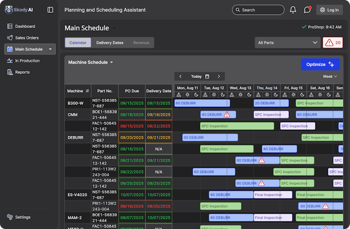 Skody AI is a production decision engine and manufacturing software platform that unifies scheduling and operational visibility for discrete manufacturing environments. The platform integrates labor availability, material constraints, work cell capacity, and outside processing requirements into a comprehensive scheduling and monitoring system. The environment served includes CNC machining shops, fabrication facilities, tubing and forming operations, assembly-driven workflows, mixed-operation plants, and contract manufacturing organizations that require worker-aware planning beyond traditional ERP scheduling tools.