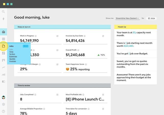 Streamtime has reinvented the timesheet by utilizing intuitive to-do lists that are auto-populated from job plans. Studio managers can drag tasks from ‘to do to ‘done’ and even add personal tasks to their schedule. All hours spent on completing tasks are captured in the job reports. The platform enables users to easily move tasks between team members, shift deadlines, and rearrange tasks on the fly.