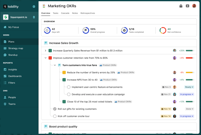Tability's suite of tools includes initiatives and tasks to track important milestones, standups for quick daily check-ins, and custom dashboards for one-click reporting with presentation-ready views. The platform also offers automated reminders and reporting capabilities that enable users to handle data collection, task syncing, and report building. Tability seamlessly integrates with project management tools like Jira, Asana, ClickUp, and Linear, allowing users to map team efforts to their strategic priorities.