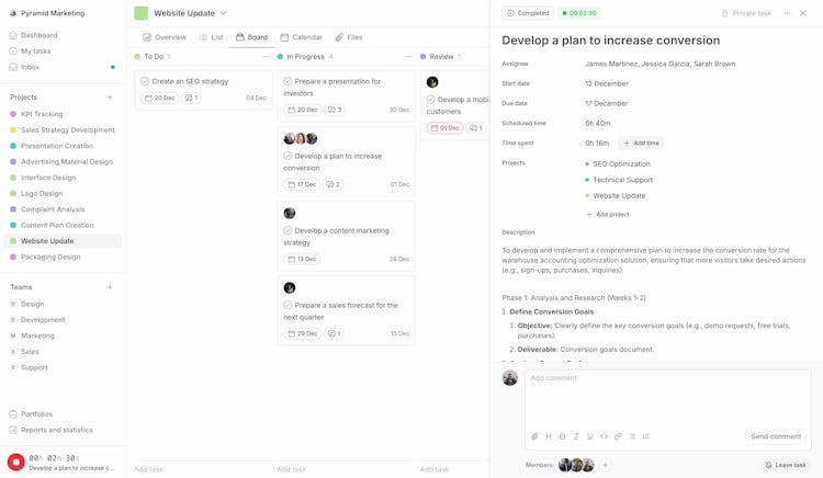 Taskera offers features to help users manage projects effectively. Teams can efficiently organize and track projects, monitor progress, and align their efforts to ensure timely and successful project completion. The platform also allows users to create, assign, and track tasks across the team, ensuring everyone knows their responsibilities and deadlines for smooth task execution. It also generates reports to evaluate task completion, track time spent, and measure efficiency for effective project management.