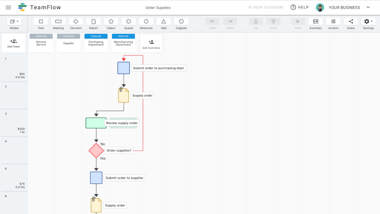 TeamFlow is the simple visual way to understand your business. Automate processes with the push of a button. Create, edit, and share process flows in seconds. TeamFlow allows users to visually document their business processes. Use their intuitive visual editor to create process repositories that can be the shared source of truth for your organization.