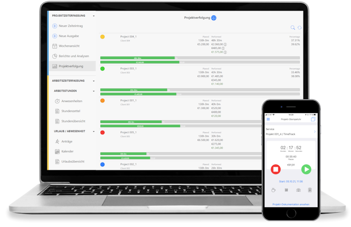 TimeTrack can be used via WebApp, on smartphones (iOS and Android) as well as on a Tablet (TimeTrack Terminal App). The TimeTrack Terminal App can be used for access control. With the project timer, each employee’s working hours are recorded and then evaluated in the project reports, which create a clear overview of the accomplished tasks.
