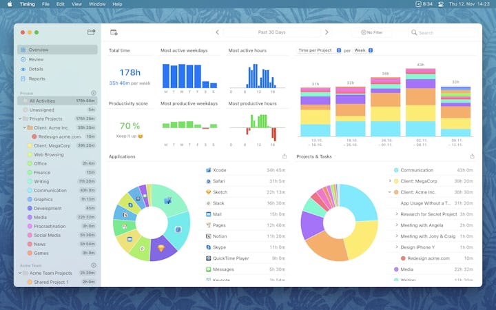 Key features of Timing include automatic time tracking without the use of timers, iPhone usage data import from Screen Time, productivity score assignment to projects for tracking progress, generation of detailed timesheets and reports, and data privacy. The software stores data locally on the Mac and offers the option to exclude certain apps from tracking. It also automatically discards data from private browser tabs. In essence, Timing offers an effective solution for individuals and teams seeking an accurate record of their time usage, with a strong emphasis on privacy.