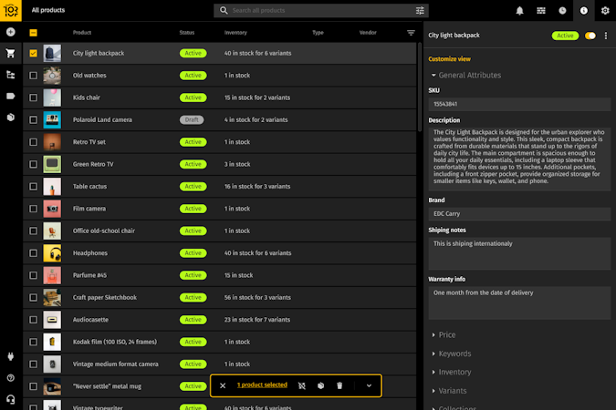 Improve product data quality and consistency with structured attributes, centralized editing, and AI-powered tools for generating product descriptions and auto-tagging content.