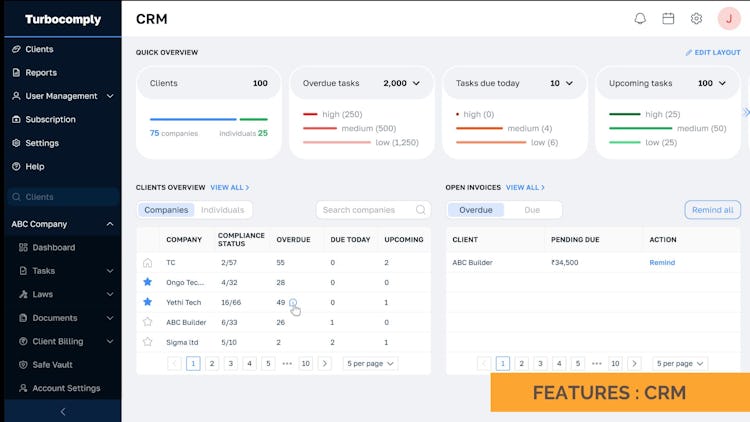 TurboComply includes a task management module that allows users to create and assign tasks to their team or clients, leveraging automation capabilities to save time and reduce errors. The compliance management functionality enables organizations to track compliance activities and adhere to regulatory standards, with automated workflows for sending reminders, generating reports, and monitoring deadlines. The document management system also provides a centralized repository to securely store, organize, and retrieve critical documents, enabling collaboration and maintaining version control.