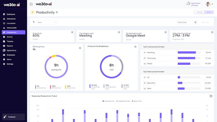 We360.ai is a cloud-based Workforce Analytics Solution designed to provide organisations with valuable insights into their employees' work environments. Whether employees are working from home, in the office, or from any remote location, We360.ai transforms data from various aspects of the workplace into meaningful information and actionable insights. This capability enables businesses to enhance productivity and improve overall work dynamics.
