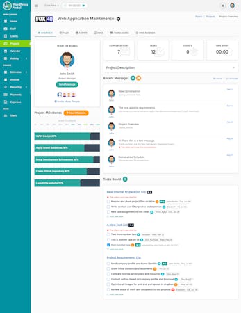 WP Portal is a project management application that helps users manage various business operations from one centralized dashboard. Organizations can invite teams and clients, send messages, assign tasks, share files, track time, share docs, send invoices, and get paid online. With WP Portal dashboard you can manage your projects and clients with 5 different user access roles. Stripe and PayPal integration allows your clients to pay invoices online. It offers the following features: - Invite clients and give them access to projects - Assign tasks to the team and set deadlines - Add and set project milestones and progress - Create and share events with team and clients - Receive timesheets from team members - Realtime notifications - Email alerts and notifications - Financial charts and reports - Create and send estimates to clients - Generate and send invoices - Receive payments from clients using credit cards and PayPal - Track business expenses and revenue. - Upload and share files on the cloud with Google Cloud Storage. - Apply brand logo, colors, and font.