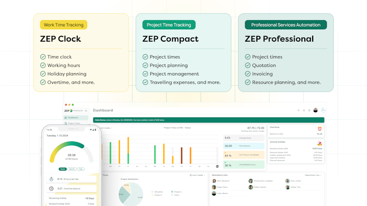 ZEP's compact version allows users to tap into professional project time tracking and covers the administration of employees, customers, and projects and facilitates associated reporting.