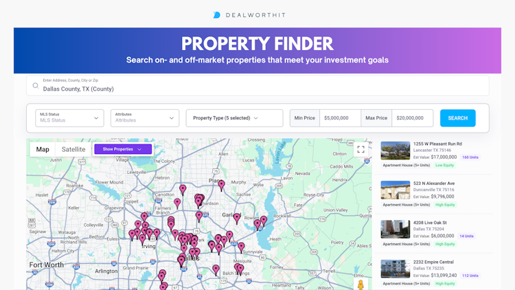 DealWorthIt is your all-in-one platform for finding and analyzing real estate deals. Our Property Finder quickly helps you find both on- and off-market properties that meet your investment goals.