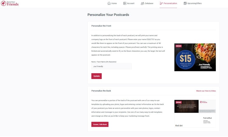 From Your Friends is a cloud-based relationship marketing solution for real estate agents. Each month, agents receive a new personalized postcard featuring an outstanding free offer or discount from a popular local restaurant, merchant, or attraction. Agents can easily upload or enter their SOI or customer database into the simple contact management system, allowing them to seamlessly send these valuable offers to their network. The monthly gifts keep agents top-of-mind, encouraging loyalty and referrals from past customers.