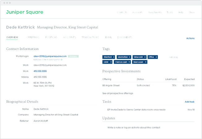 Juniper Square is the leader in partnership enablement for the private funds industry. It offers a universal system for GPs and their LPs to seamlessly connect and communicate across every stage of their partnerships, from fundraising to investor management and fund administration. Juniper Square empowers investment managers to accelerate fundraising, scale their operations efficiently, and improve investor satisfaction. More than 2,000 GPs rely on Juniper Square to manage more than 600,000 LPs in more than 38,000 private funds.