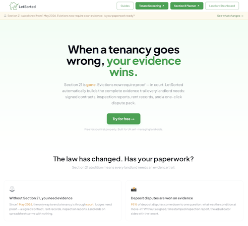 LetSorted is a property management platform designed for landlords who manage residential properties independently in the United Kingdom. It addresses the legislative change brought by the abolition of Section twenty one effective May first two thousand twenty six and the requirements under the Renters Rights Act two thousand twenty five. The platform automates the creation of a court-admissible evidence trail encompassing tenancy agreements, inspection reports, rent ledgers, maintenance records and dispute bundles. The system ensures that landlords maintain comprehensive documentation throughout every stage of the tenancy lifecycle.