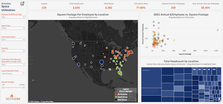 RefineRE is a SaaS portfolio management software designed to help corporate real estate businesses gain real-time insights into property portfolios using data analytics, benchmarking, and reporting tools. It offers a CRE portfolio module, which allows administrators to capture and visualize critical data points from various business systems.