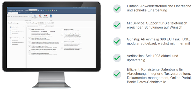 Add-on modules such as banking interfaces, DATEV integration, and a mobile app provide extended functionality. Win-CASA also offers strong third-party partnerships such as document management integration with DocuWare and owners meeting solutions from Vulcavo.