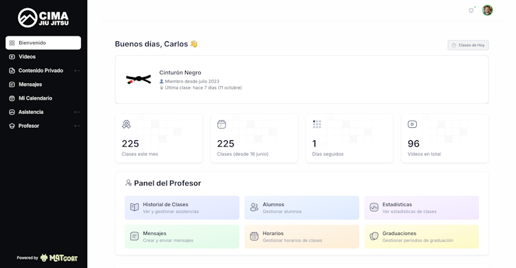 MatGoat is a management software platform designed specifically for Brazilian Jiu Jitsu and martial arts academies. The platform serves as a centralized administrative solution for student management, attendance tracking, payment processing and communication functions within combat sports facilities including Brazilian Jiu Jitsu, Judo, Taekwondo, Karate, Boxing, Mixed Martial Arts and Muay Thai schools. The system addresses the needs of academy owners and instructors who require professional grade management tools to streamline daily operations while maintaining focus on instruction and student development. The solution supports the full student lifecycle by consolidating data and processes within a single platform.