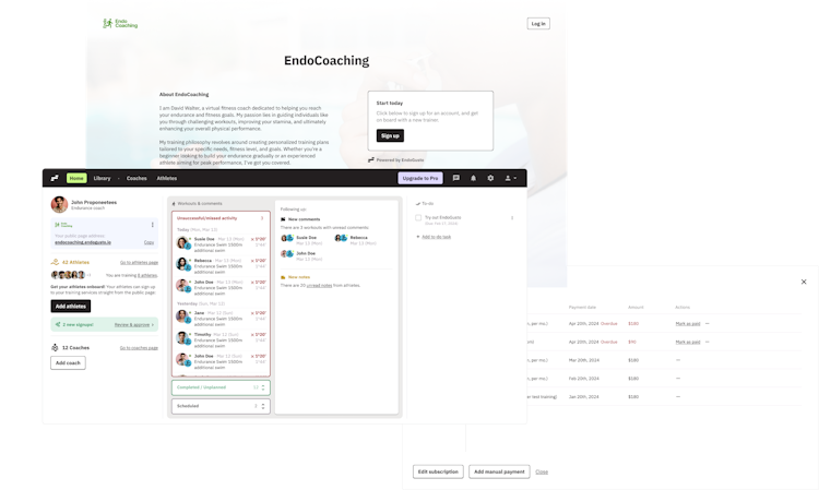 Business Operations: Manage payments with Stripe integration, assign athletes to multiple coaches, and operate under a personalized subdomain.