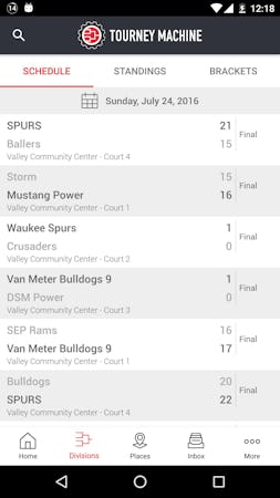 Tourney Machine offers a scheduling tool, ScheduleAssist, which allows organizations to define restrictions for participating teams, confirm court availability for tournaments, and assess the distance between sports complexes. Managers can schedule games using a drag-and-drop interface and set-up the maximum or minimum time between consecutive games. It also lets users display the tournament’s standings and notify teams about their brackets via texts.