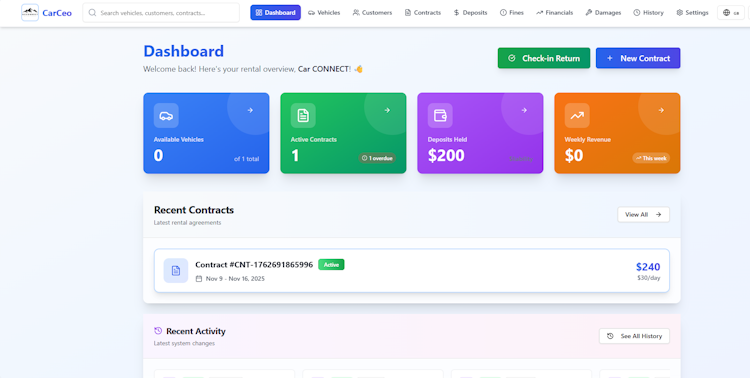 CarCeo enhances communication through integration with WhatsApp for sending contracts and reminders, as well as automated email notifications. Financial tracking capabilities allow for detailed revenue reporting, expense monitoring, and overall financial management. The software also supports team collaboration with role-based access controls, ensuring appropriate permissions for different team members. Real-time analytics dashboards deliver actionable insights into business performance, while multi-language support—covering English, Arabic, and Kurdish—ensures accessibility for a diverse user base.