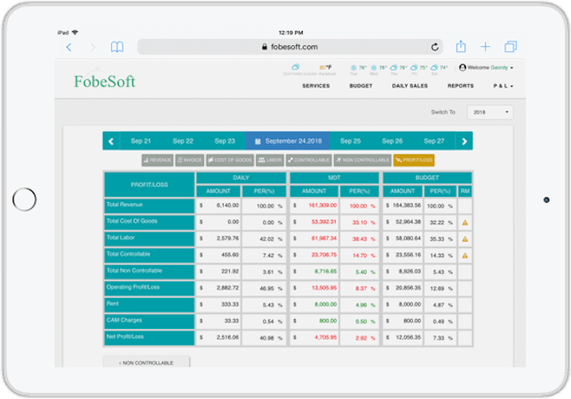 Fobesoft founder, Geordy Murphy conceived the idea of restaurant management software years ago based on his collective knowledge in managing his own chain of restaurants. His ability of understanding underlying insights hidden in reports have been hardwired into the system. It detects problems in real time and urge you to act before it could affect your business. One of the powerful tools under our arsenal is daily sales report, which gives you foresight into month end projection which will alert you of any upcoming surprises