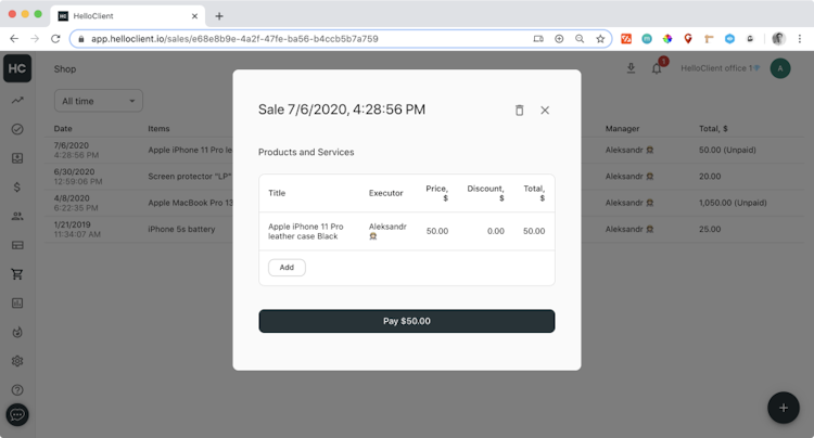 As its basis, HelloClient has a ticket management module, inventory, retail sales, customer notifications, analytics, and employee control. Management of a service center or a repair shop does not require special training and is immediately ready for work. Suffice to add employees, upload your logo to printed templates, and you can start placing the first orders and selling goods.