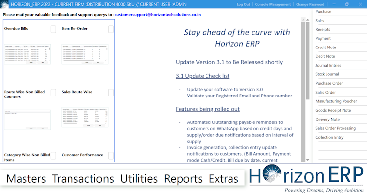 Horizon ERP is an accounting and GST billing platform designed to help small businesses in the distribution, manufacturing, and retail sectors generate invoices, control inventory, track GST returns, and manage other financial operations. It includes various modules for GST billing, GST filing, financial accounting, and inventory reporting.