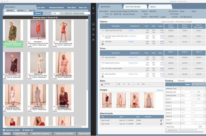 With Indigo8, brands can manage the creation, production, selling, and wholesale of their products. Product development features including visual style guides, drag and drop design builders, sample management, bills of material management, and more, allow businesses to control the design and production of their products. Product sales can then be managed, including wholesale, retail store, and eCommerce, with tools for processing indent and stock orders on a desktop or iPad, cost control, invoicing, end-to-end warehouse planning and control, purchase orders, integrated POS, and more.