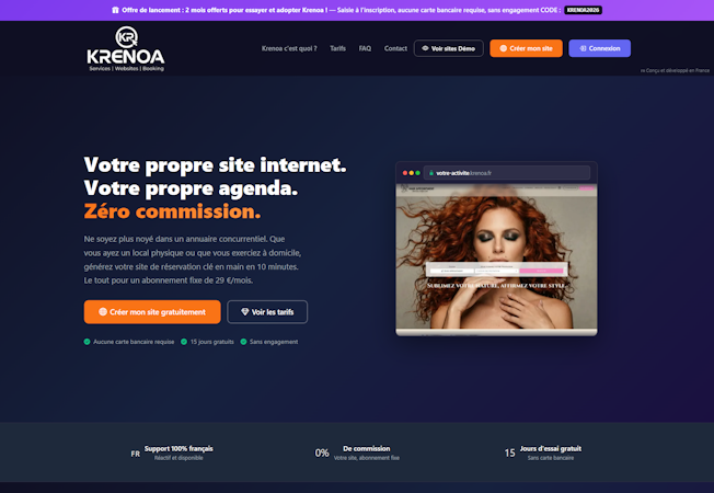 Krenoa is a web-based solution designed for beauty and wellness professionals in France. The software enables independent practitioners and salon operators to deploy a branded website with integrated appointment scheduling. It follows a fixed monthly subscription model without transaction commissions, allowing professionals to retain full control over client relationships and revenue streams. The platform accommodates both mobile practitioners and established businesses with physical locations and can be operational within minutes.