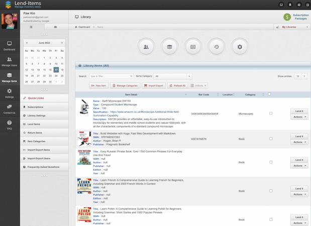 LendItems is designed to help users create an online catalog of all of their belongings and monitor who has lent them. You can use LendItems to track books, CDs, DVDs, video games, laptops, tablets, phones, cameras, bikes, automobiles, tools, firearms, musical instruments, school inventory, laboratory equipment, furnishings, sporting goods, and other office and technological devices.