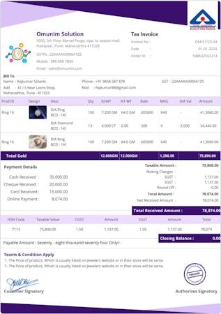 Online Munim is a comprehensive jewelry management software designed for businesses ranging from small enterprises to large-scale operations with multiple branches. The system integrates essential business functions including inventory management, billing, and accounting into a unified platform. The software enables jewelers to manage stock inventory using barcode or RFID tags, create GST-compliant invoices, track sales and orders, process credit or debit notes, monitor daily expenses, and generate detailed accounting reports.