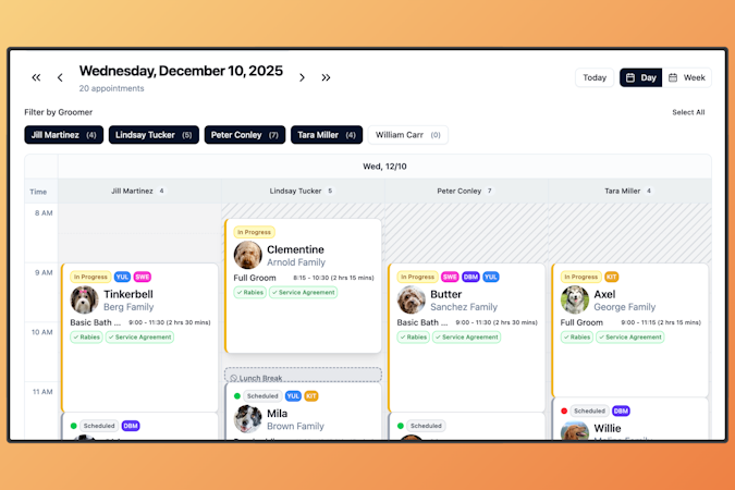 • For mobile grooming operations, Packyard offers address-based scheduling for route optimization, reducing drive time between jobs. Appointments can be assigned to specific service vehicles or territories, and multi-van fleets can be managed with individual groomer schedules and availability tracking.