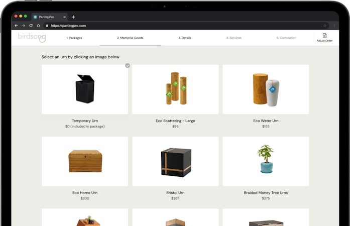 Parting Pro offers an online e-commerce website to market custom funeral services, which follow FTC regulations. The application lets users generate ratings and reviews from families to improve online reputation and customer engagement.