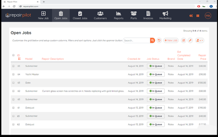 Repair Pilot helps managers gain visibility across repair processes with a centralized dashboard that displays open jobs, customer information, parts inventory, invoices, and reports. Users can send personalized messages to customers via email and SMS, which helps service teams optimize engagement. Administrators can also create check-in receipts that include job reference numbers, item repair details, and contact information.