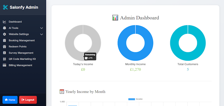 Its website builder allows users to create professional websites displaying services prices galleries and social links with fully editable content capabilities. The booking management system includes customizable working hours and holiday calendars for both the salon and individual staff members enabling around the clock appointment scheduling with integrated payment processing. Staff management features provide dedicated portals where stylists can view schedules manage working hours and submit leave requests. The client relationship management component includes comprehensive customer profiles booking history tracking favourites lists digital wallets and service based surveys to gather feedback. Revenue tracking capabilities offer detailed financial insights with monthly income breakdowns by staff member and service category. Salonfy also incorporates loyalty programme management with reward points automated promotional offers and targeted marketing capabilities to enhance client retention.