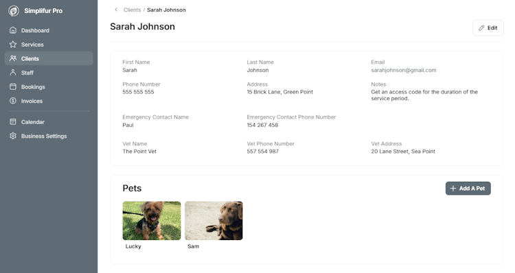 Simplifur Pro is a cloud-based pet business management solution tailored to South African pet care professionals. The software delivers a centralized digital interface for coordinating bookings, managing client relationships, overseeing team activities and tracking operational performance. It serves independent pet sitters, grooming salons and multi-staff pet care operations seeking to professionalize service delivery while maintaining detailed records. An integrated sustainability tracking component enables businesses to monitor and offset their environmental impact.