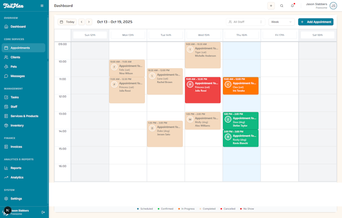 TailPlan includes business analytics tools for tracking revenue and service metrics, while offering staff management functionality for planning shifts and balancing workloads. The platform stores complete pet profiles with medical notes, service preferences, and special requirements to help maintain consistent care records.