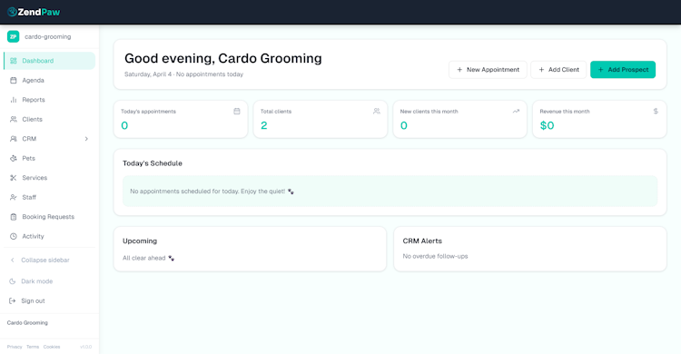 ZendPaw is a bilingual pet grooming management software designed for independent groomers, grooming salons, veterinary clinics, mobile groomers and pet daycare facilities operating in the United States and Mexico. The platform provides tools to organize appointments, maintain client and pet records, automate communications and generate business reports. It addresses operational challenges such as missed appointments, fragmented scheduling, last-minute cancellations and communication barriers between English and Spanish speaking clientele.