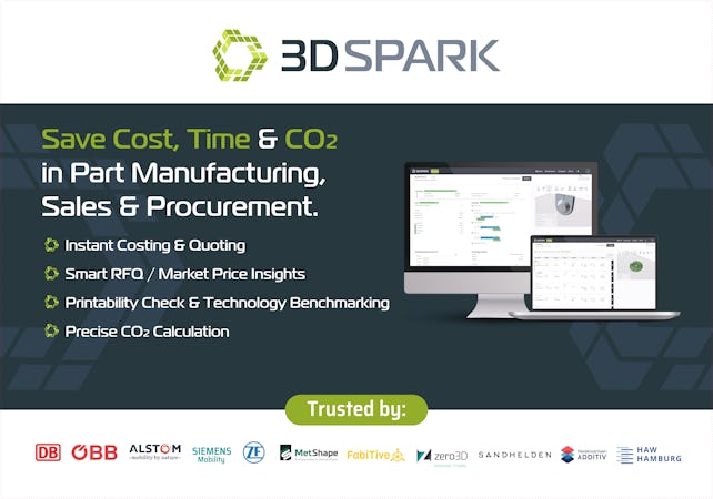 OEMs use 3D Spark to support technology selection based on conventional technologies, make or buy decisions with precise make costing & instant supplier target price feedback, sustainable decision-making with precise CO2 footprint calculations, and drive AM success with Cost, Lead Time & CO2 savings KPIs, enabling powerful C-level reporting.