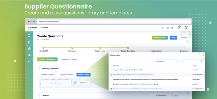 Aavenir RFPflow is a request for proposal solution that allows easy and effortless RFI/ RFP/RFQ creation using questions’ libraries and templates. It manages RFP-to-award lifecycle stages by assigning suppliers and stakeholders on a milestone-based RFP Workflow and sends automated alerts and notifications for deadlines.