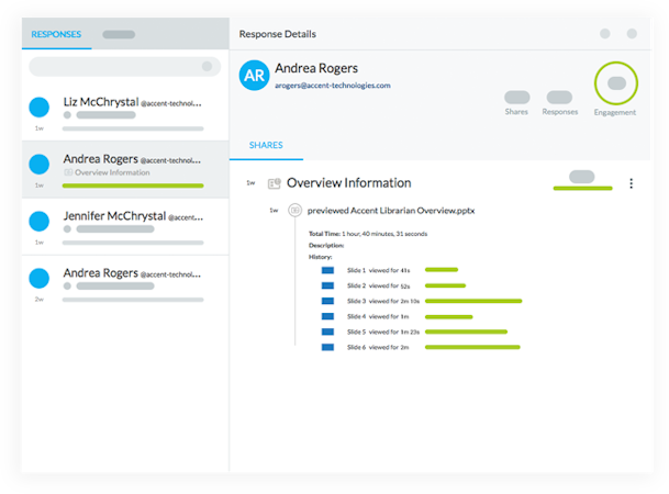 Accent Connect offers integration with third-party platforms including SugarCRM, Salesforce, Insightly, Dropbox, Google Drive, Microsoft Outlook, Marketo, and HubSpot. It also helps users personalize materials such as brochures and presentations according to buyers' requirement and share them via private portals. Managers can track buyer activities in real-time, analyze content performance, and track clients’ responses using roll-up views and content scorecards.