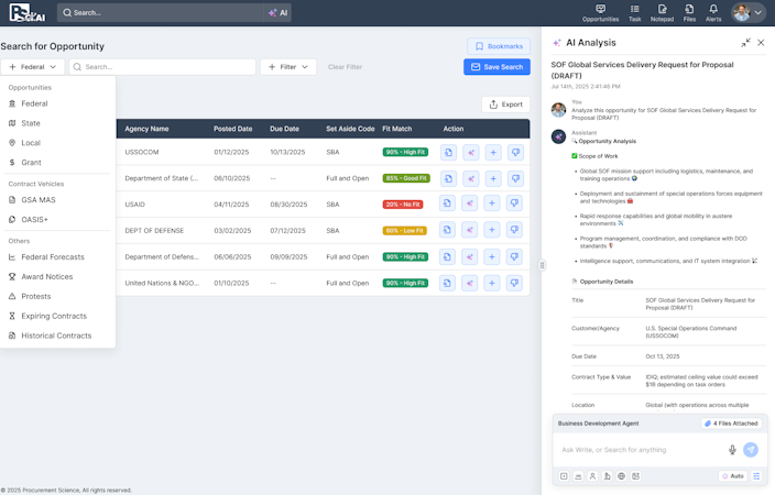 Procurement Sciences transforms how contractors find, win, and deliver government contracts, combining industry expertise with state-of-the-art AI to maximize growth and efficiency in government procurement.