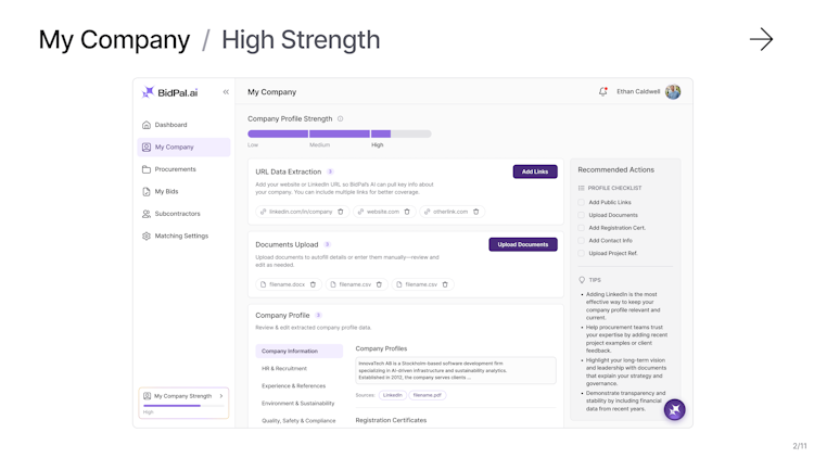 BidPal AI is an artificial intelligence–powered platform that streamlines bid and tender management for organizations competing for public and private sector contracts. The solution supports small to medium sized businesses across multiple industries with emphasis on construction and infrastructure, information technology services, consulting and facility management. The platform addresses resource intensive tasks associated with identifying relevant procurement opportunities and developing competitive bid responses by automating opportunity matching, proposal generation and bid optimization.