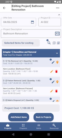 Users can describe the job in plain language, and CostingWizard generates chapters, items, and resources automatically. Customize as needed to fit each project.