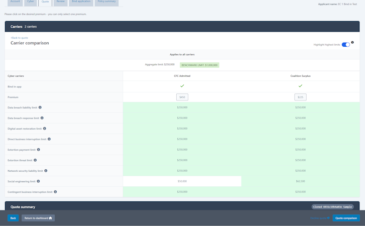 The software features a comprehensive set of functionalities that enhance the quoting workflow. Users configure preferred carrier selections and eliminate redundant data entry through a centralized question bank that replaces multiple carrier questionnaires. The platform provides side-by-side comparisons of carriers, premiums and coverages to support identification of optimal price and coverage combinations. Embedded cyber insights deliver benchmarking information on limit adequacy and industry loss data to guide data-driven decision making. Real-time premium calculations delivered via API connections from insurer systems ensure quote accuracy.