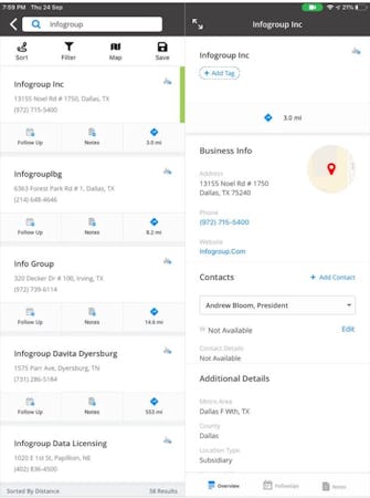 The platform enables administrators to add status icons, tags, and notes across leads to manage them in a centralized dashboard. Data Axle Genie provides a quick view panel, which allows teams to track follow-ups and other information related to qualified sales opportunities. Supervisors can also utilize the Android and iOS mobile applications to view assigned leads and saved searches.