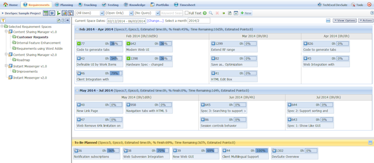 DevSpec is a solution for managing product requirements collaboratively, as part of the development and testing process. Built from the underlying principles of gather, define, manage and evolve, DevSpec enables the whole team and any project stakeholders to collectively finalize requirements before any development phase begins. The system is flexible enough to cater for more formal Enterprise-type definitions or a more agile, user story-based approach while giving everybody a voice in terms of adding comments or supporting documents. Requirements changes can be implemented, triggering email notifications flagging those updates with escalation rules and prompting for responses.